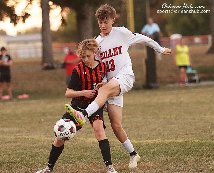 Holley’s Isaac Bartlett reaches around Lyndonville’s Maddox Smith to drive the ball ahead.