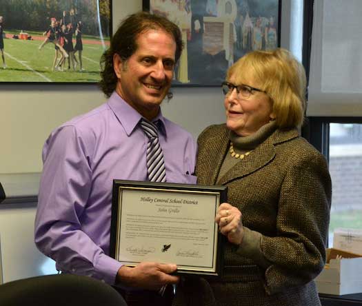 Grillo’s achievements were highlighted during the Board of Education meeting this evening, including 16 times the Genesee Region coach of the year, five times the Section 5 coach of the year, and a finalist for national coach of the year. His teams also won 20 GR league titles and 12 Sectional championships.