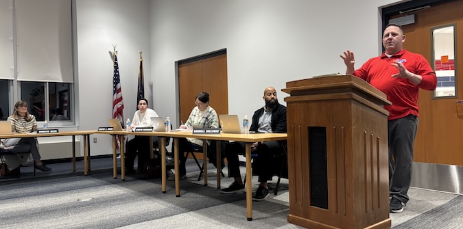 Photos by Tom Rivers: Eric Valley, Medina’s athletic director and head football coach, shares his reasons for supporting a merger with Albion for football at the modified, junior varsity and varsity levels. Next to him, from right to left, are Board of Education members Donnell Holloway, Jennifer Buondonno, Kristin Grose and Annette Allis.
