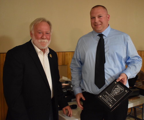 File photo by Tom Rivers: This photo from March 25, 2023 shows Fran Gaylord, president of the Holley Fire Department, presenting a president’s award to Kevin Dann for all of his assistance, including helping to organize the department’s roster on the computer. Gaylord has retired East Battalion Deputy Fire Coordinator and Dann has been appointed to the part-time position.