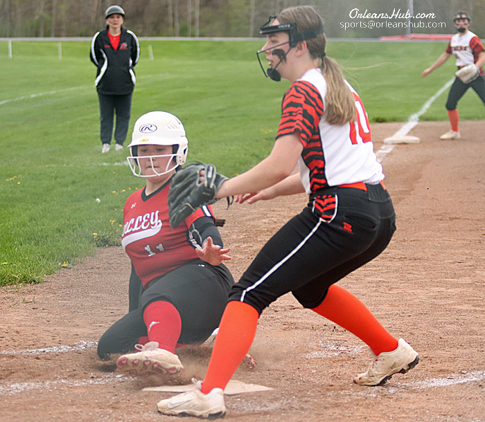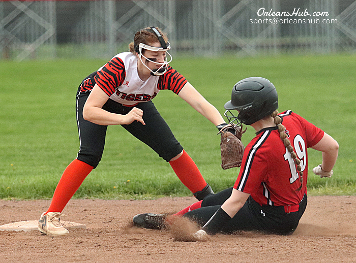 Photos by Cheryl Wertman – Lyndonville’s Braelynn Dillenbeck tags out Holley’s Charlie Gearing at second base during the Lady Tigers win over the host Lady Hawks this afternoon.