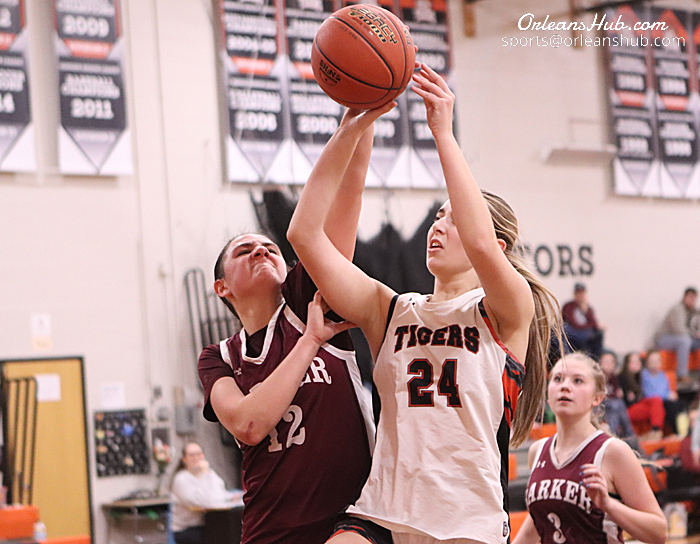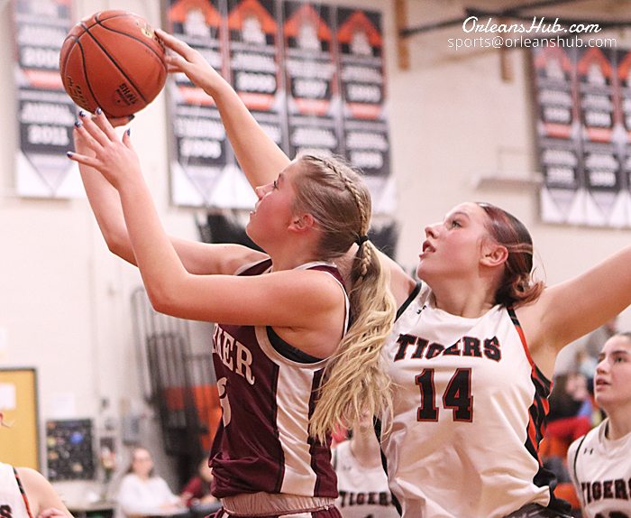 Photos by Cheryl Wertman – Lyndonville’s Emily Dill puts up a shot as Barker’s Elise Monaco tries for block during thee Lady Tigers home court Senior Night win this evening.