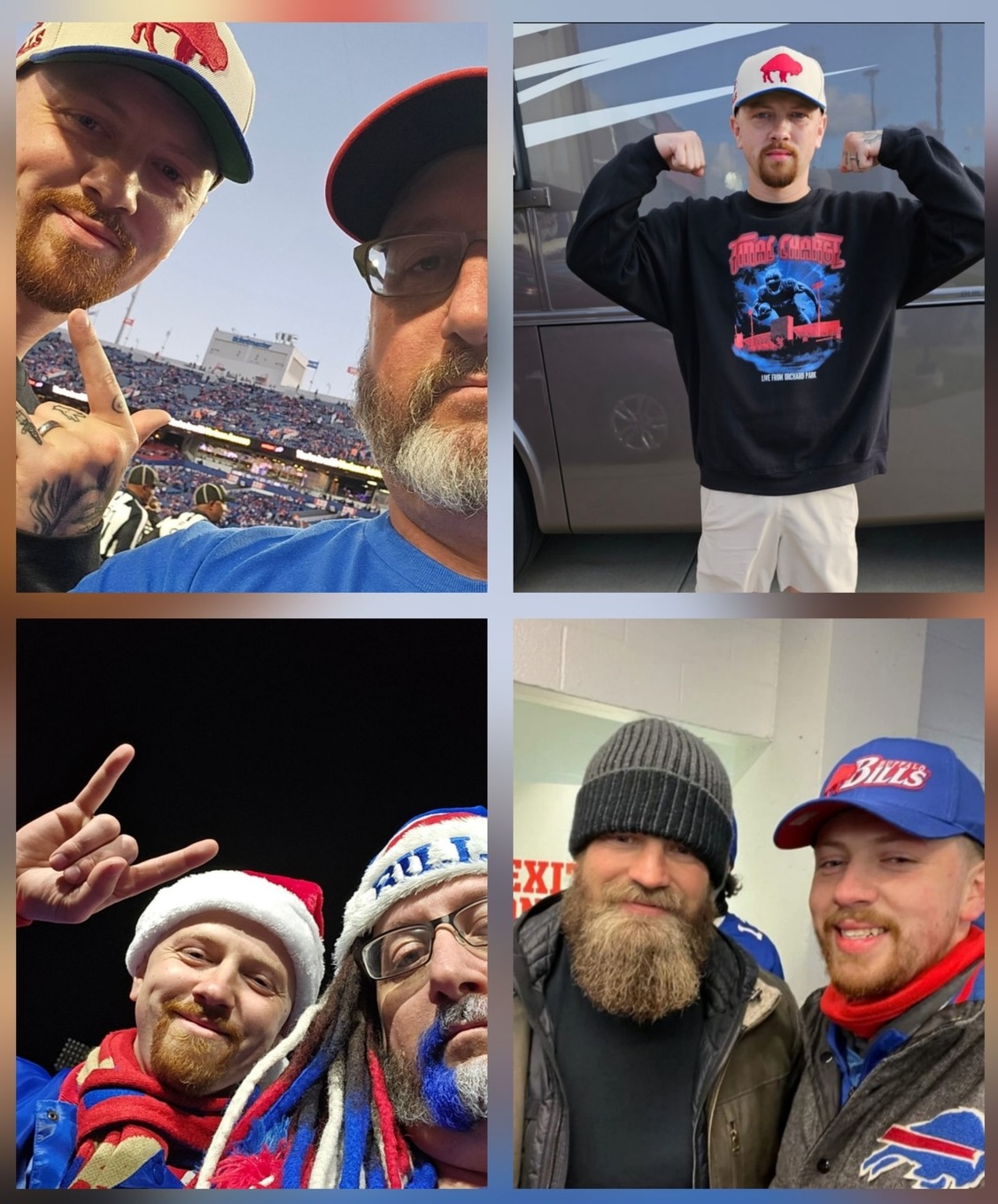 Tre Allport, 31, has been a regular with his father at the Bills games. In bottom right photo he is shown with retired quarterback Ryan Fitzpatrick, a Buffalo Bills legend.