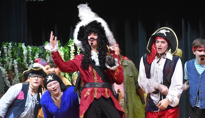 Austin Fonda plays the role of Captain Hook in Neverland. Captain Hook wants to kill Peter because he cut off his hand and threw it to a crocodile. Hook leads a group of pirates. In this photo, Fonda sings about a mysterious woman who has captured Hook’s fancy.