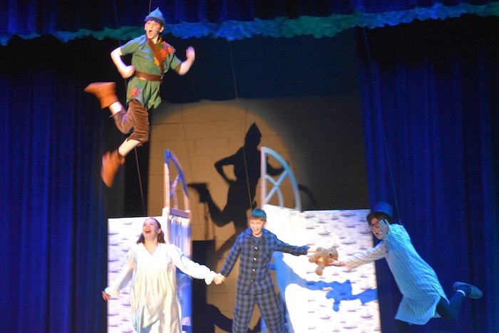 Gavyn Draper stars as Peter Pan and he gets to fly about the stage in several scenes. Peter Pan and other characters – Wendy, John and Michael Darling – get to fly by using wires with harnesses and pulleys.