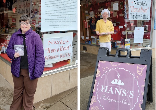 Left – Provided photo: Nicole Tuohey holds one of the heart cookies like her mother used to make and sell at Case-Nic Cookies to benefit the Arc and developmental disabilities. This is the eighth year of selling “Have a Heart” cookies, during which time they have raised more than $13,000. (Right – Photo by Ginny Kropf) Hans Rosentreter stands in front of Hans Bakery, holding a plate of “Have a Heart” cookies to promote the fundraiser started by former owner of the store, Mary Lou Tuohey and her daughter Nicole. Rosentreter is continuing the tradition Mary Lou and Nicole sponsored for years in support of Arc GLOW during Developmental Disabilities Awareness Month. The basket raffle in the store window will also support the ARC and run through March 30.