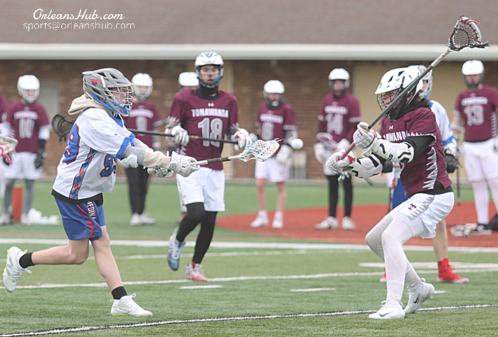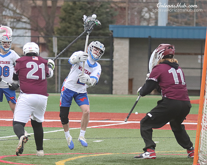 Photos by Cheryl Wertman – Medina’s Gavin Dahlhaus puts a shot on goal during the Mustangs season opening lacrosse win over Tonawanda at Vets Park this afternoon. Defending for Tonawanda are Jacob Goddert (21) and Dominic Marchiano (11).