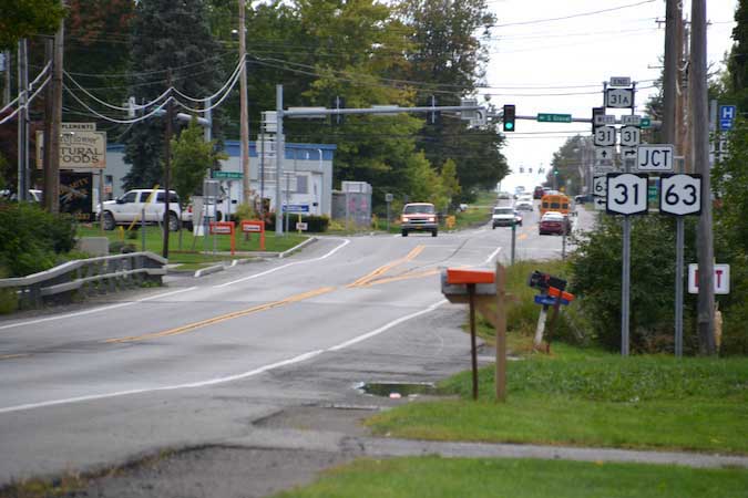 The sidewalks will go 200 feet east of the Intersection of Maple Ridge Road (NY 31A) and South Main Street (NY 63), and then to 1,900 feet east of the intersection of Maple Ridge Road (NY 31A) and South Main Street (NY 63).