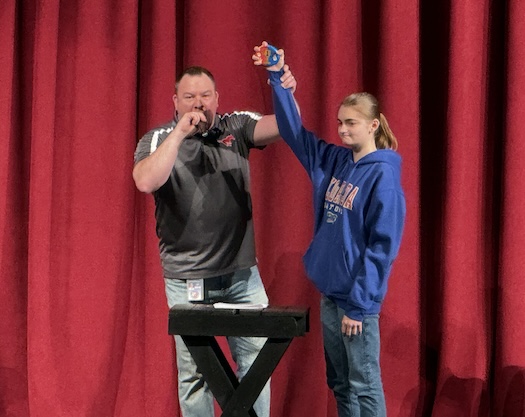 Seventh-grader Heather Daniels is crowned the Grand Champion of the Medina, junior high school rock paper scissors tournament.