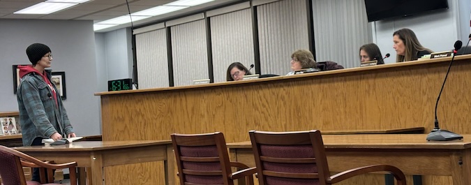 Photo by Tom Rivers: Megan Wakefield, leader of the Medina Community garden, speaks during Monday’s Village Board meeting. Pictured, from right to left, include Medina Mayor Marguerite Sherman, Deputy Mayor Jess Marciano, Trustee Debbie Padoleski and Village Clerk/Treasurer Jada Burgess.