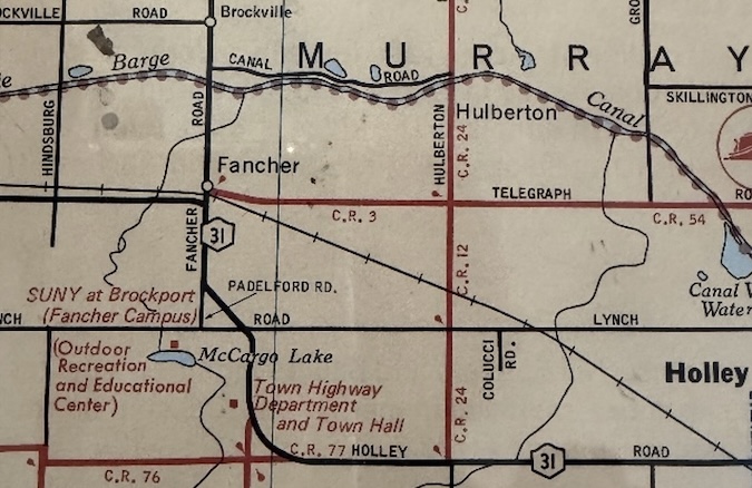 A Town of Murray road map shows Padelford Road, which connects to Route 31 near the Hickory Ridge Golf Course and RV Resort (shown on map as SUNY at Brockport – Fancher campus.