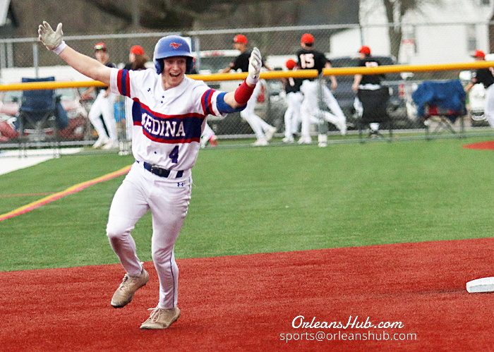 Medina’s Ryan Pegelow celebrates hitting a home run as he rounds second base.