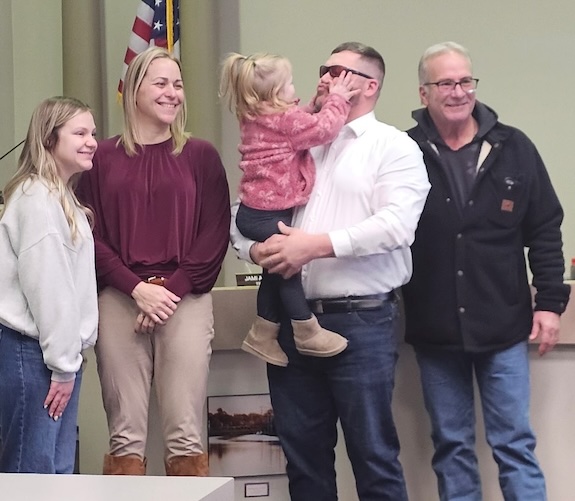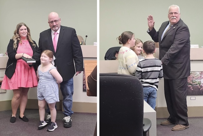 (Left) Jami Allport is a new village trustee. She took the oath of office while standing with her husband Geno and their daughter, Hensley. Mrs. Allport is executive director of the Genesee-Orleans Ministry of Concern. (Right) Kevin Sheehan took the oath of office and was joined by his three grandchildren – Charlotte, Wrenyn and Jack. Sheehan is a retired plumber and pipe fitter and has served an Albion trustee, deputy mayor and code enforcement officer. He also is a commissioner for the Albion Joint Fire District.