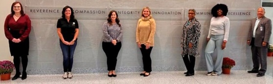 Senior Health leaders selected to participate in Cohort 11 of the Health Leadership Fellows program of the Health Foundation for Western and Central New York. From left to right they are: Renee Hungerford, MHI – CEO/CIO, Community Action of Orleans and Genesee; Karen Kinter – CEO, Oak Orchard Health; Larissa Bachman, MSW – Chief Operating Officer, Pinnacle Community Services; Sarahmona Przybyla, PhD, MPH – Assistant Dean, University at Buffalo School of Public Health and Health Professions; Tanya Staples – Principal Consultant at Perrin Associates – Team Coach; Brandi Haynes – Chief Programming Officer, Community Action of WNY; and Michael C. Osborne – VP of Strategic Growth and Portfolio Development, Catholic Health.