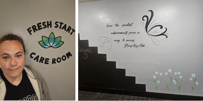 (Left) Cassie Healy is the Fresh Start program manager. (Right) This artwork was completed by SUNY Brockport students.