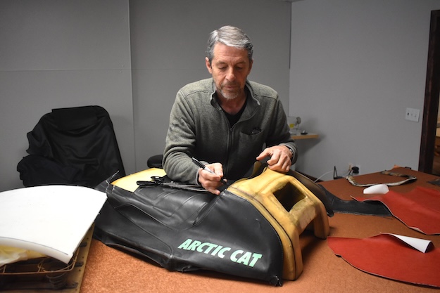 Jon Rissinger creates a pattern for a new cover on a snowmobile seat. He makes new fabric for furniture, car seats, motorcycle seats, boat seat and snowmobiles. He also is skilled a chair caning.