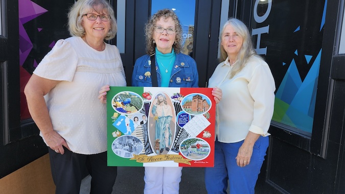 Photo by Ginny Kropf: Carol Culhane holds the special poster she created for St. Rocco’s 50th annual Italian Festival, scheduled for Aug. 31. She presented it on Friday to Amy Engert, left, chair of the festival’s Legacy Tent, and Jeanne Maxon, right, who chairs the festival with her husband Chuck.