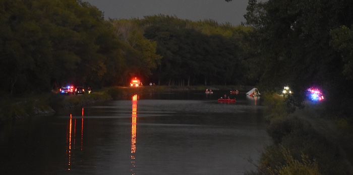 Law enforcement detained one person who fled on foot north of the canal. Another person is presumed to be drown and first responders are attempting to recover the body.