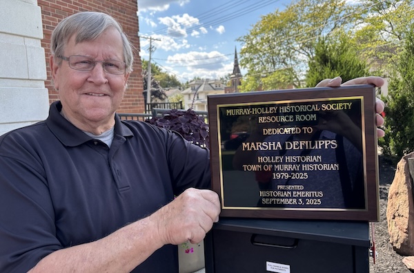 Mayor Bower said the plaque is heavy. Village officials decided to have it displayed on Medina Sandstone outside the front entrance of the building. The mayor said he appreciates that the Town of Sweden donated the stone which was in a town park.