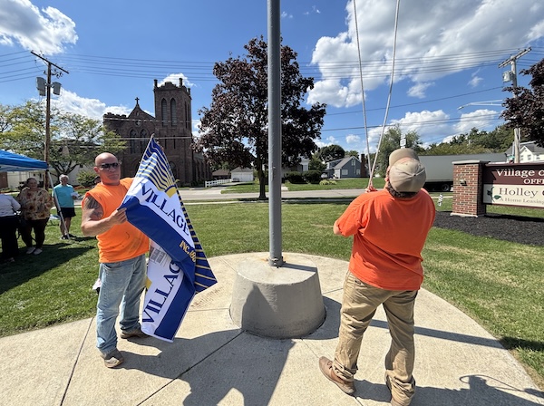 Holley DPW employees Mike Church, left, and Ryan Johnson get the new Holley flag ready to be raised for the first time.