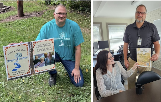 (Left) Provided photo: The Rev. Randy LeBaron kneels with a sign along the path showing his parents during a previous Memory Walk in Holley. (Right) Brittany Dix, community outreach specialist at Hospice of Orleans and the Rev. Randy LeBaron, spiritual care/bereavement counselor, look over a flyer promoting Hospice of Orleans annual Memory Walk Sept. 21.