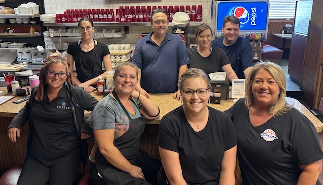Some of the staff at Sam’s Diner pose for a photo this afternoon on the reopening of the popular restaurant in Holley’s Public Square. In front from left include Dena Torcello from Skytab, Brittany Dearcap, Lauren Ault and Angela Gitsis. Back row: Jennifer Tardge, owner George Gitsis, Kim Hodom and Dave DiSalvo.