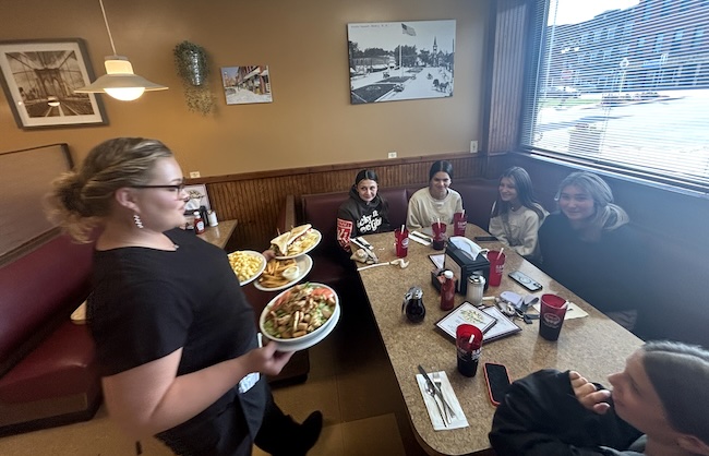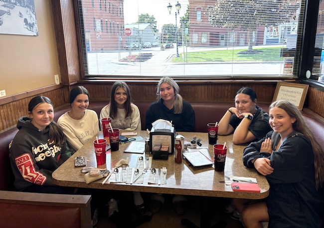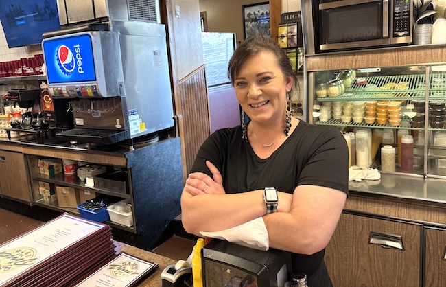 Photos by Tom Rivers: Lauren Ault serves a group of Holley girls food this afternoon at Sam’s Diner. Ault started at the diner about a decade ago. She and many other employees were grateful to be back at Sam’s for its reopening today. The restaurant had been closed since March 1, 2024 when the back wall collapsed at the historic building.