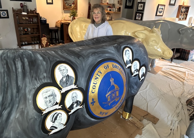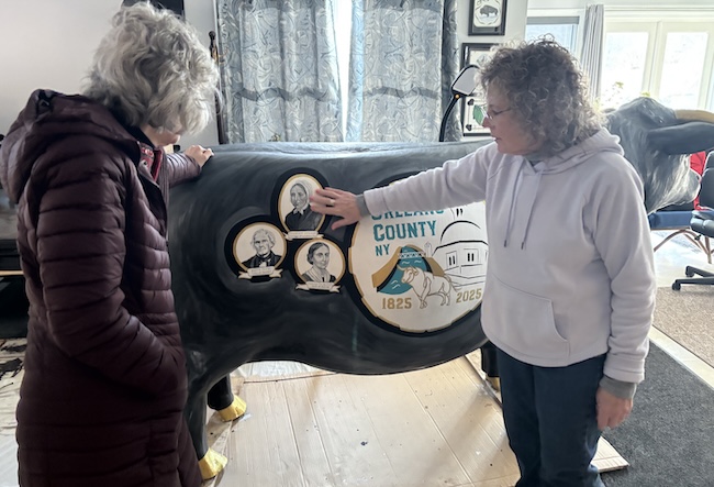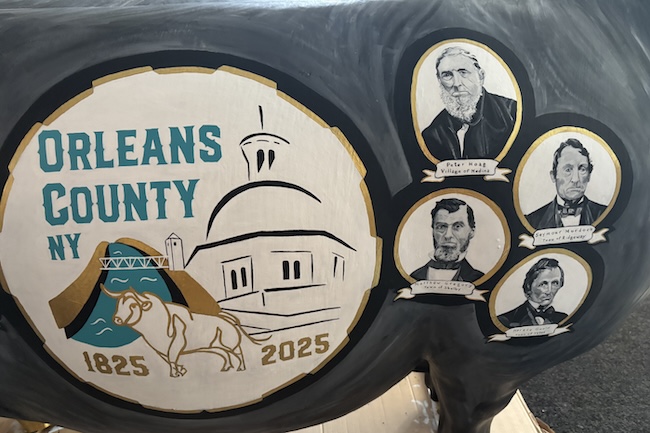 She thinks the painted oxen can have a similar impact in Orleans County. She has painted the third one. Stacey Kirby Steward painted the first one in 2024 during the Orleans County 4-H Fair. It included an agricultural scene on one side and fair scenes on the other side. That ox is at the fairgrounds.