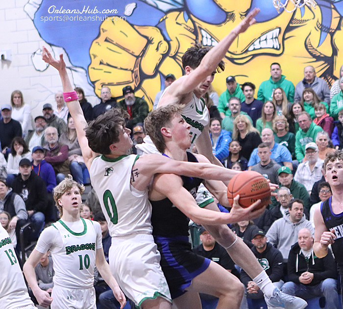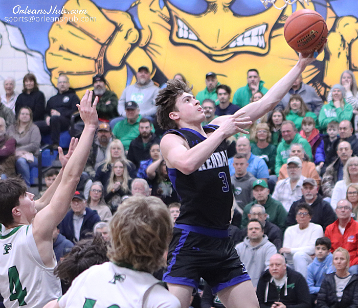 Photos by Cheryl Wertman – Kendall’s CJ D’Agostino goes in for a layup during the Dragons sectional quarterfinal loss to Pembroke at Oakfield-Alabama this evening.