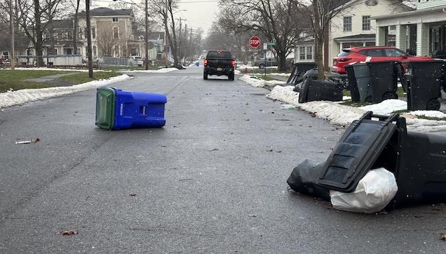 These garbage cans blew into South Clinton Street in Albion after being emptied by Modern Disposal.