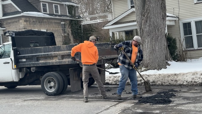 Albion DPW crews are out today putting cold patch on roads. Steve Borowczyk, left, and Shaun Stephens were working on Ingersoll Street.