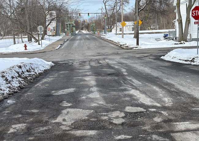 Photo by Tom Rivers: The pavement on Ingersoll Street in Albion has cracks and potholes after four months of punishing winter weather. This photo was taken on Thursday. The Village of Albion DPW was out today using cold patch to fill in the pavement.