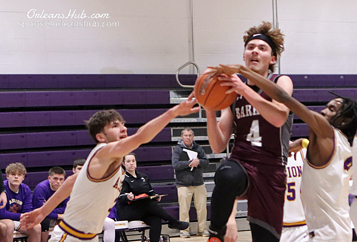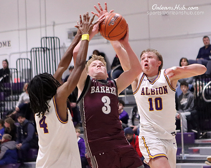 Barker’s Donovan Hefferon goes to the basket between Albion defenders Wesley Olles, left, and Tyler Cody.