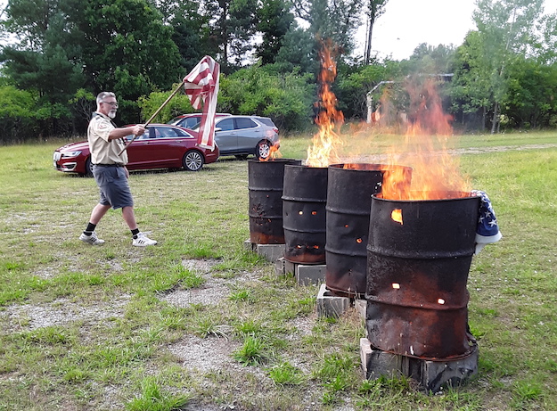 Scout leader Michael Reese walks a flag up to burn barrel for proper disposal.