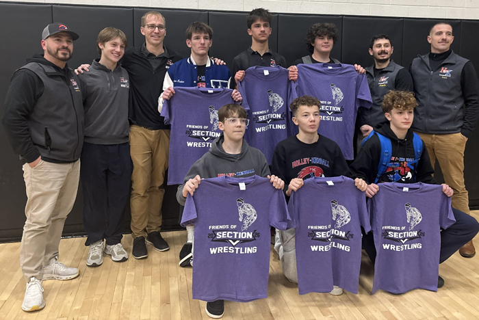 Contributed Photo – Holley-Kendall’s Section V state qualifying wrestlers meet here with their coaches. In front are Jeremy Lutes, Jayden Rivera and Carson Cady. In back are Coach Jim Mapes, Coach Bruce Rasmusson, Coach Jeff Lutes, Brenden Eichas, Parker Denning, Immanuel Cornell, Coach Ed Narburgh and Coach Kevin Avery.