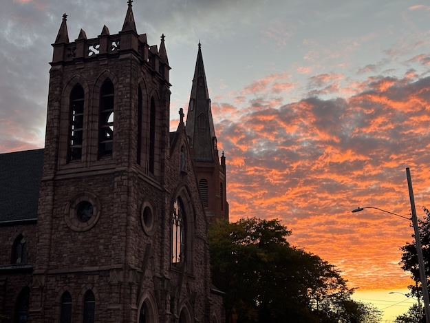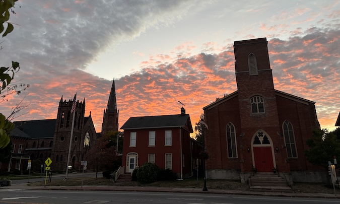 Photos by Tom Rivers: This photo at 6:55 p.m. shows St. Joseph’s Catholic Church at left, then the First Baptist Church of Albion, and Christ Church (Episcopal) at right.