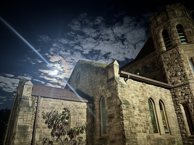 The moon is shown at 8:47 p.m. high above the Pullman Memorial Universalist Church in Albion.