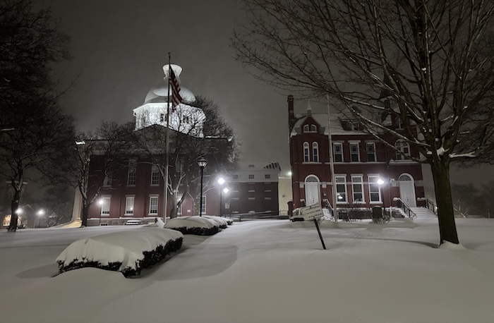 Photo by Tom Rivers: The Orleans County Courthouse and County Clerks’ Building in Albion are shown at about 7 p.m. on Jan. 25, 2026 after a big snowfall throughout the day.